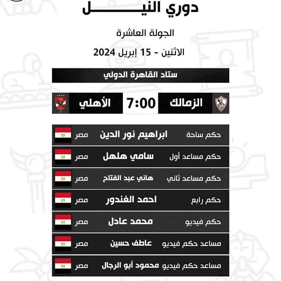 وسيدير مباراة الأهلي والزمالك في الدوري المصري، طاقم حكام مكون من: إبراهيم نور الدين: حكم ساحة، ويعاونه كل من سامي هلهل، حكم مساعد أول، وهاني عبد الفتاح حكم مساعد ثاني، وأحمد الغندور حكم رابع، ومحمد عادل حكم فيديو وعاطف حسين مساعد حكم فيديو، ومحمود أبو الرجال مساعد فار ثان
