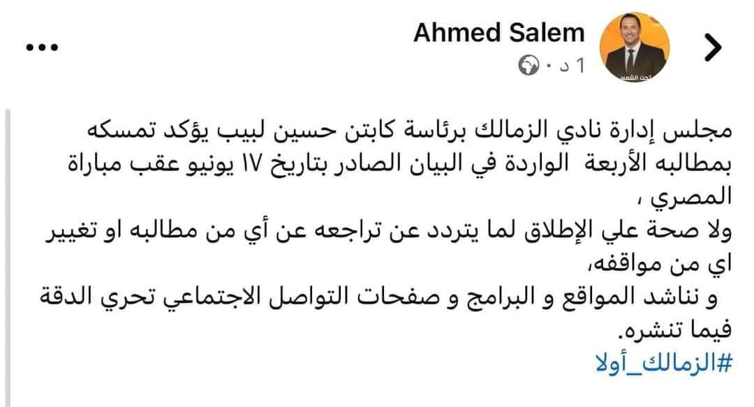 وكتب سالم عبر صفحته على موقع التواصل الاجتماعى فيس بوك: "مجلس إدارة نادي الزمالك برئاسة كابتن حسين لبيب يؤكد تمسكه بمطالبه الأربعة الواردة في البيان الصادر بتاريخ 17 يونيو عقب مباراة المصري".