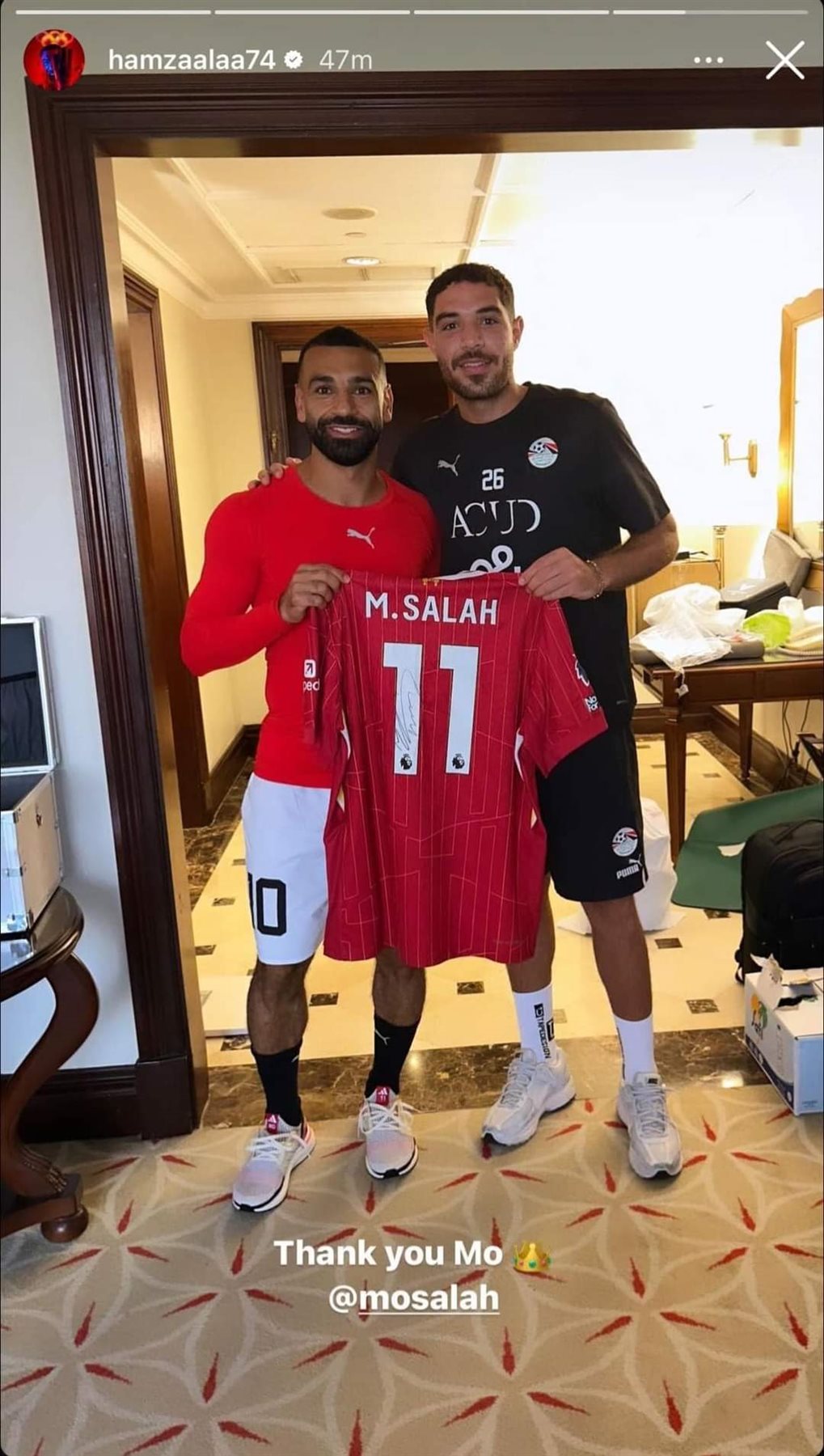 محمد صلاح يهدى قميص ليفربول للحارس حمزة علاء في معسكر المنتخب