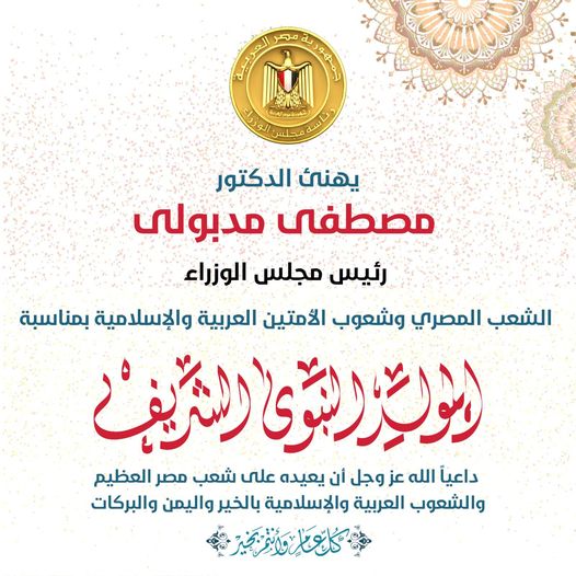رئيس الوزراء يهنئ الشعب المصرى بمناسبة المولد النبوى الشريف