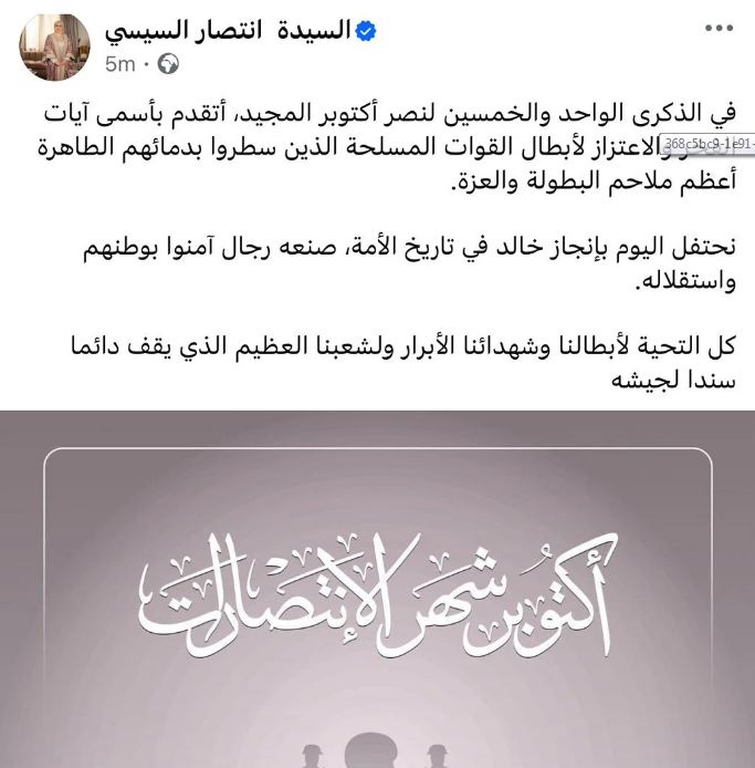 وقالت انتصار السيسي، عبر صفحتها الرسمية بموقع التواصل الاجتماعي "فيس بوك":"في الذكرى الواحد والخمسين لنصر أكتوبر المجيد، أتقدم بأسمى آيات الفخر والاعتزاز لأبطال القوات المسلحة الذين سطروا بدمائهم الطاهرة أعظم ملاحم البطولة والعزة"، مضيفة:"نحتفل اليوم بإنجاز خالد في تاريخ الأمة، صنعه رجال آمنوا بوطنهم واستقلاله.. كل التحية لأبطالنا وشهدائنا الأبرار ولشعبنا العظيم الذي يقف دائما سندا لجيشه".