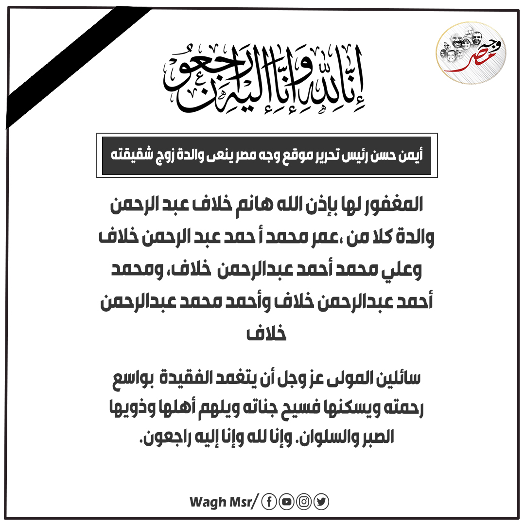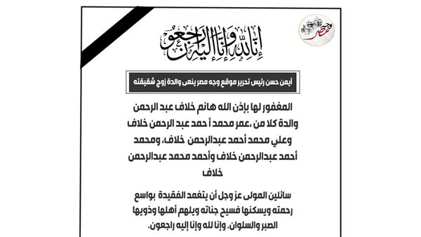 ينعى أيمن حسن، رئيس تحريرموقع وجه مصر والدة زوج شقيقته، المغفور لها بإذن الله هانم خلاف عبد الرحمن والدة كلا من،عمر محمد أ حمد عبد الرحمن خلاف وعلي محمد أحمد عبد الرحمن خلاف، ومحمد أحمد عبد الرحمن خلاف وأحمد محمد عبدالرحمن خلاف.