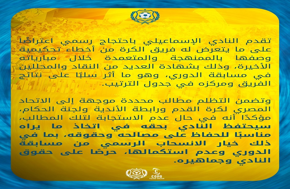 أعلن نادي الإسماعيلي في بيان رسمي أنه سيقوم بالانسحاب من بطولة الدوري الممتاز لكرة القدم اعتراضًا على الظلم التحكيمي الذي تعرض له الفريق خلال المباريات الأخيرة في المسابقة.