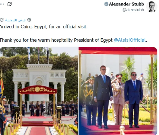 أعرب الرئيس الفنلندي ألكسندر ستوب، عن سعادته بزيارة القاهرة، مقدمًا شكره للرئيس عبد الفتاح السيسي، على حفاوة الاستقبال وكرم الضيافة، وكتب الرئيس ستوب عبر حسابه الرسمي على منصة "X": "وصلت إلى القاهرة في زيارة رسمية، شكرًا للرئيس المصري على الاستقبال الحار".